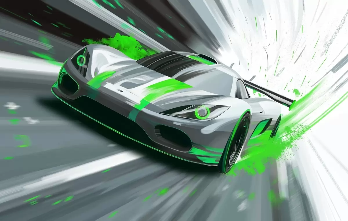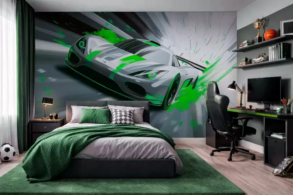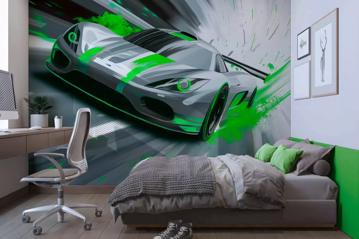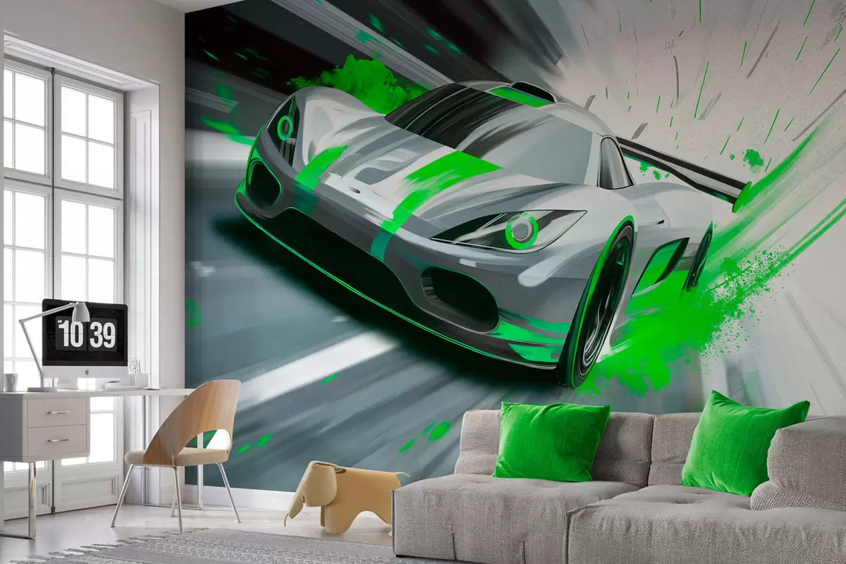 Wall murals dynamic sports car in digital drawing style with green accents Nr. w05069v4