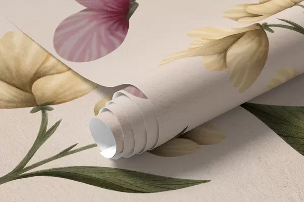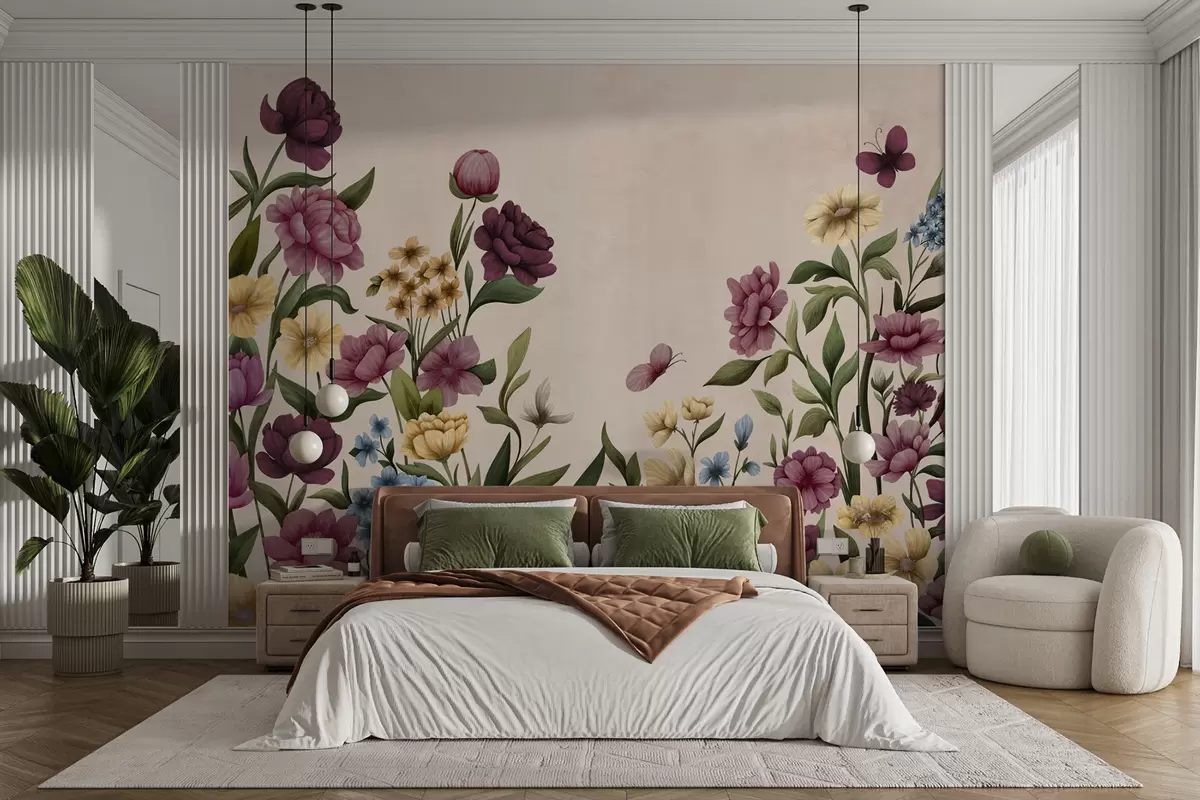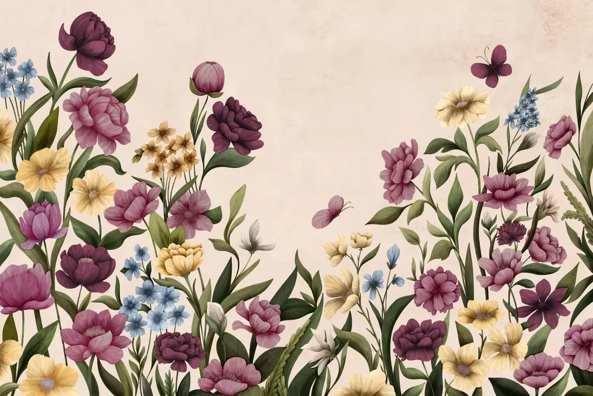 Wall murals Floral composition with plants and butterflies on light background Nr. w05072