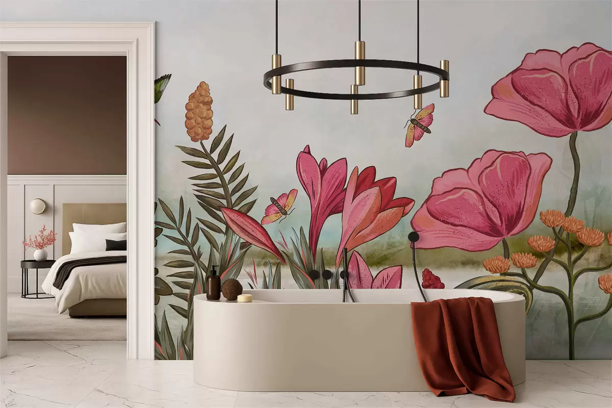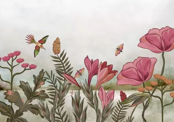 Wall murals Bright flowers with bird and butterflies Nr. w05321