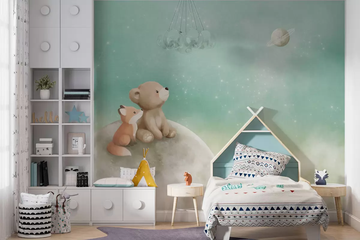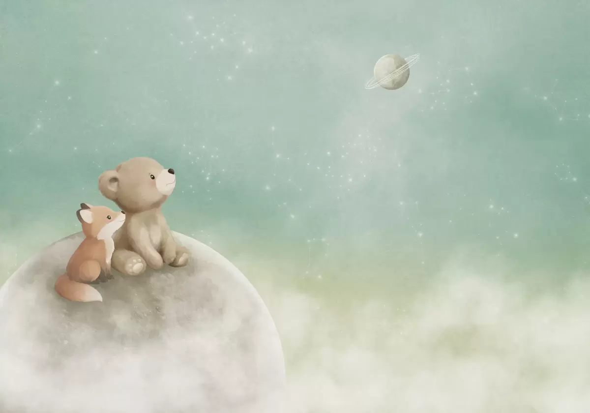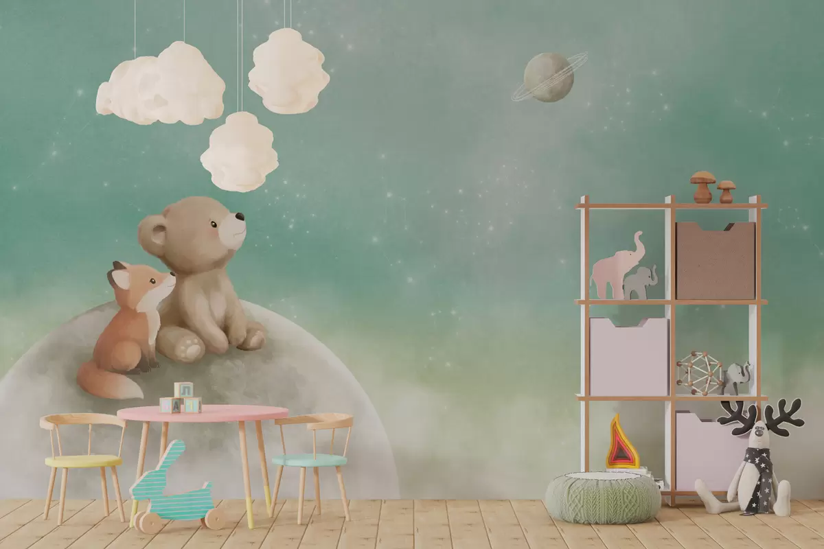 Wall murals Pastel illustration bear and fox green sky Nr. w05431v1