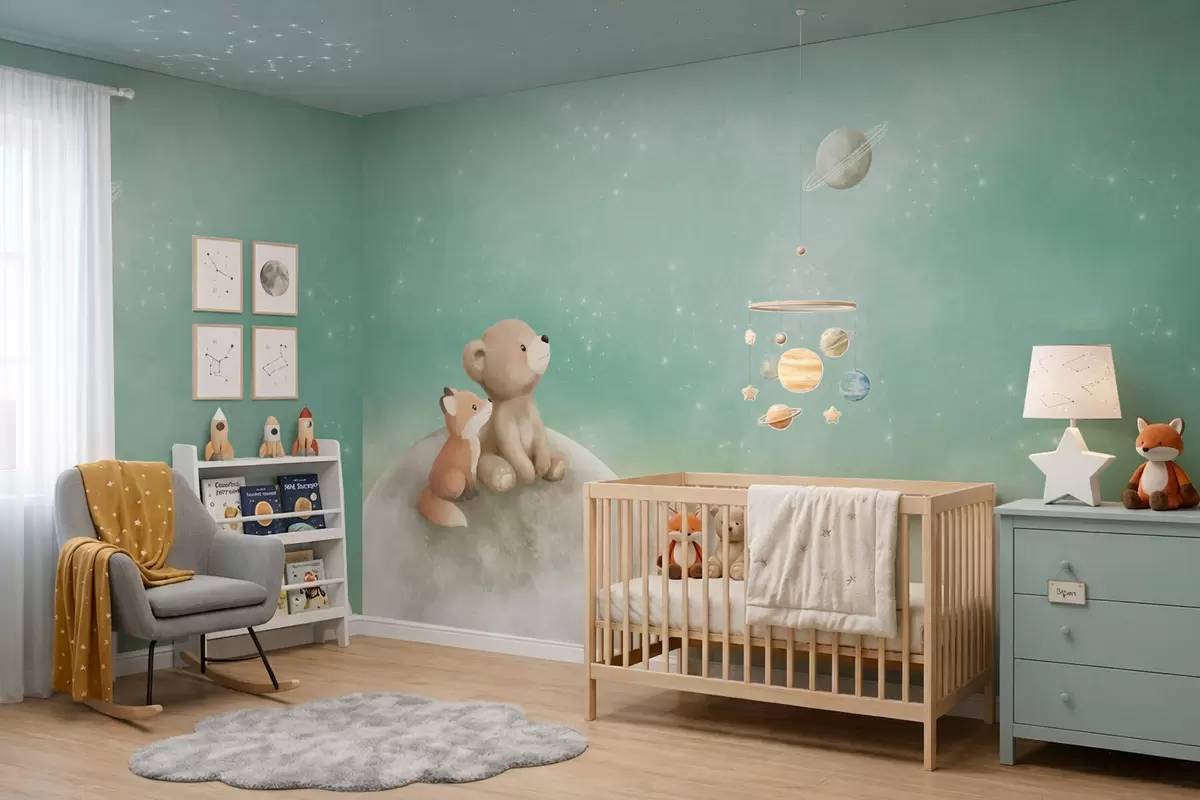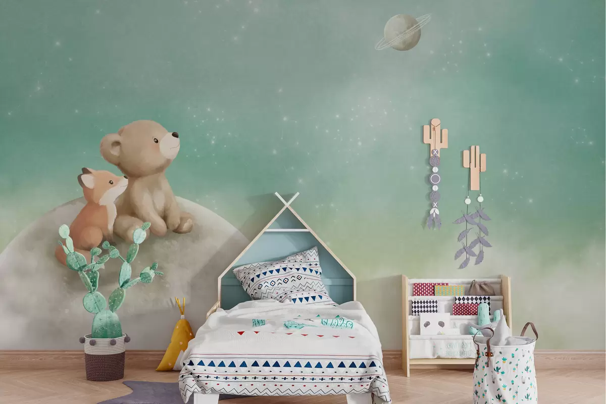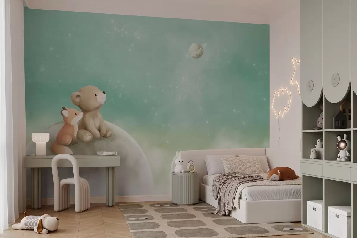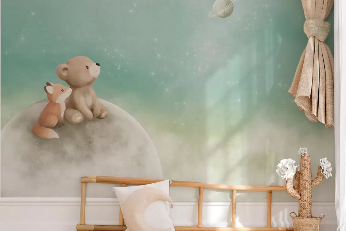 Wall murals Pastel illustration bear and fox green sky Nr. w05431v1
