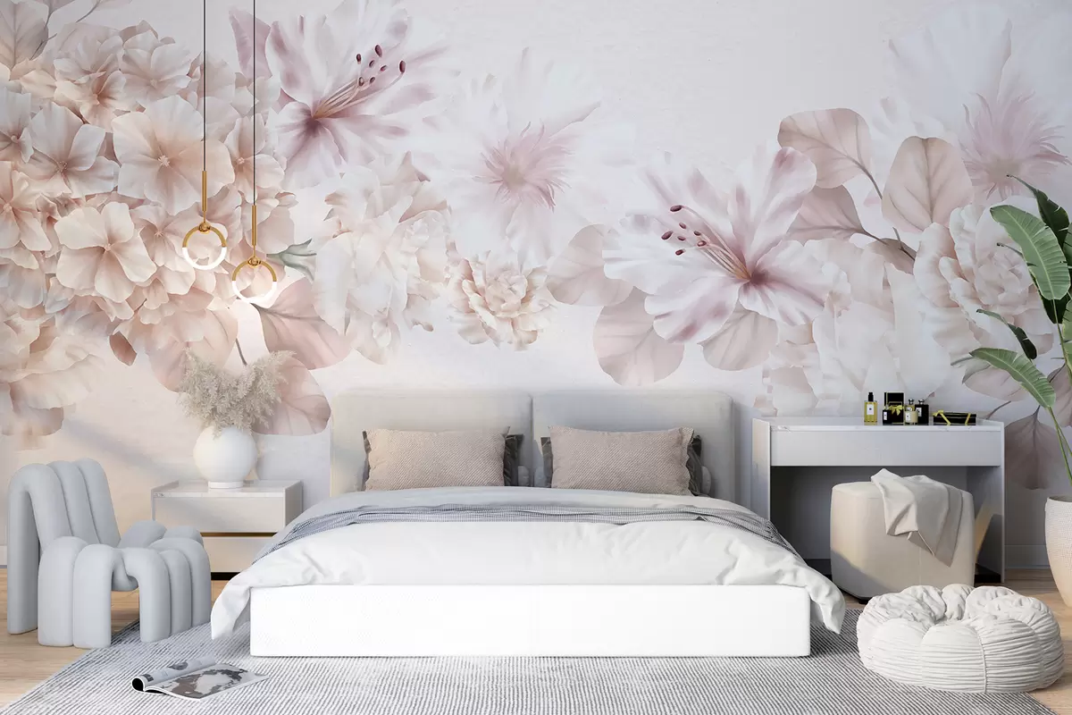 Wall murals Soft pink and white floral arrangement, with delicate petals and blossoms against a light background Nr. w07923