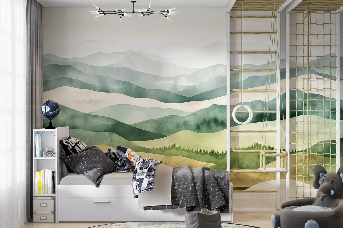 Wall murals Watercolor mountains landscapes, forest, natural green and beige colors Nr. w07950