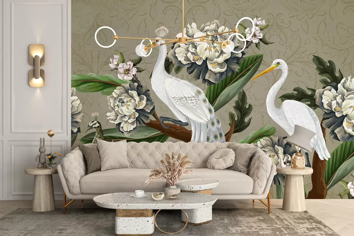 Wall murals A pair of white peacocks with long tails surrounded by large white peony flowers and lush green foliage Nr. w07975