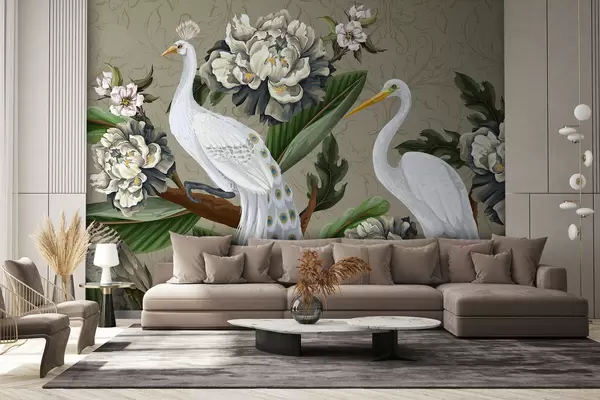 Wall murals A pair of white peacocks with long tails surrounded by large white peony flowers and lush green foliage Nr. w07975