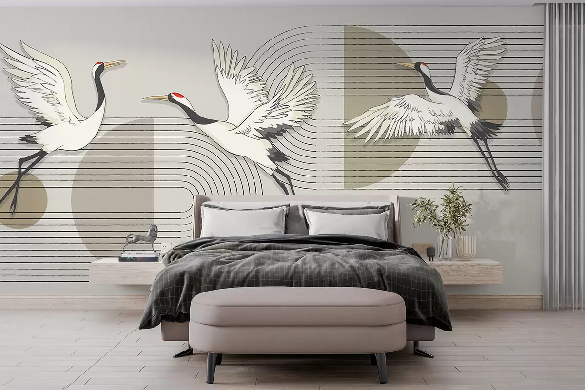Wall murals Three white cranes in flight against a geometric minimalistic background with concentric circles Nr. w08188