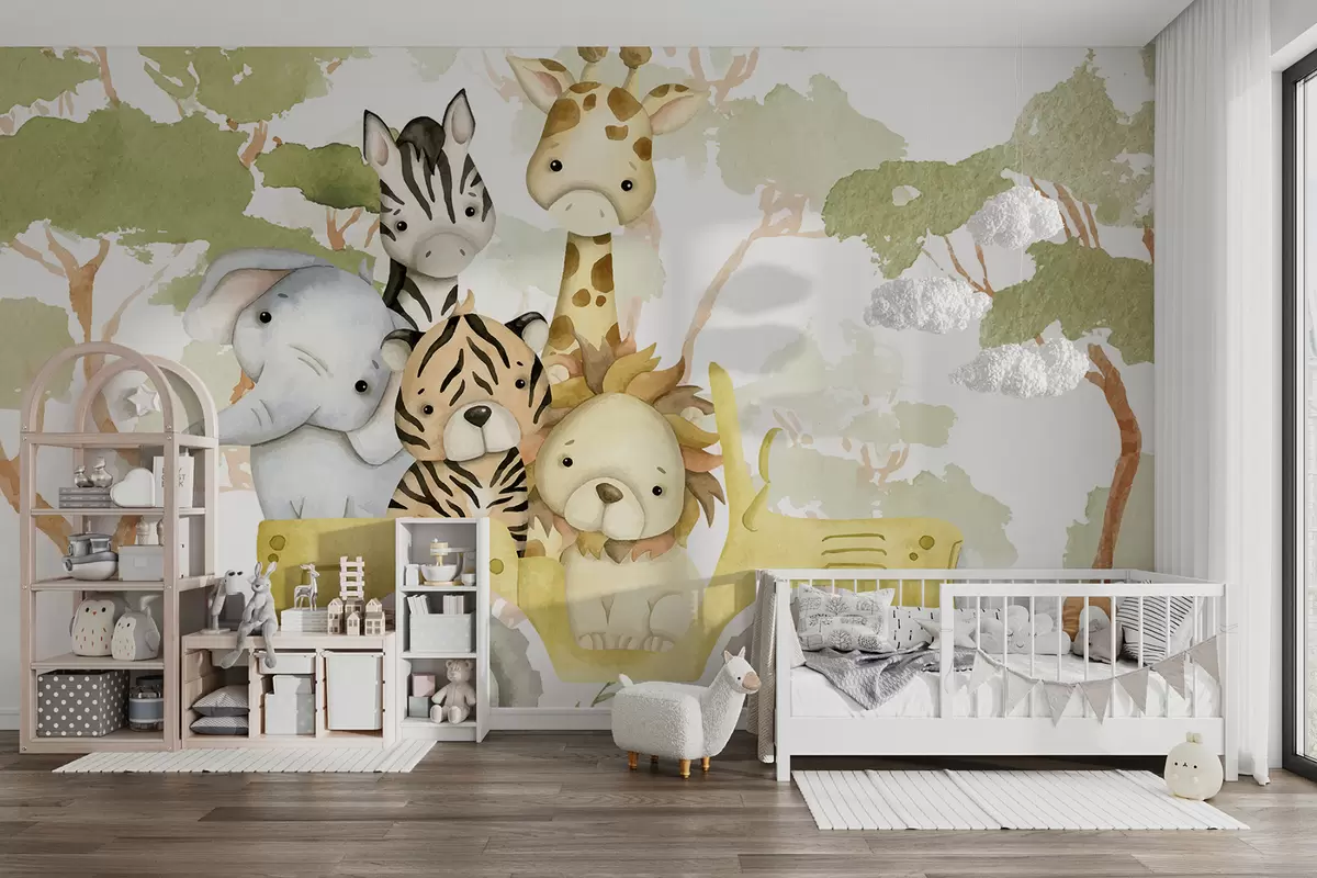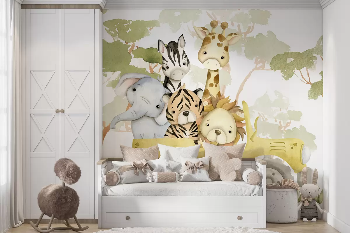 Wall murals A yellow toy truck carrying a giraffe, a tiger, a rabbit, and an elephant, against a background of green foliage Nr. w08233