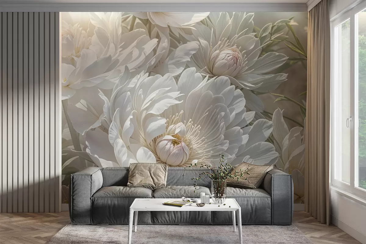 Wall murals A close-up of large, delicate white peony flowers with soft, fluffy petals and pale yellow centers Nr. w08325
