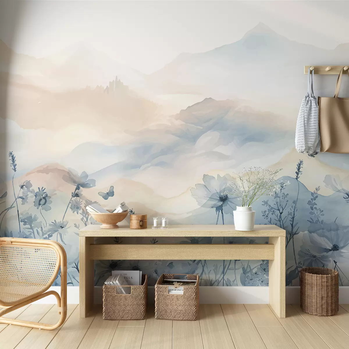 Wall murals A serene landscape with a misty mountain range in the background, surrounded by a field of delicate blue flowers Nr. w08339