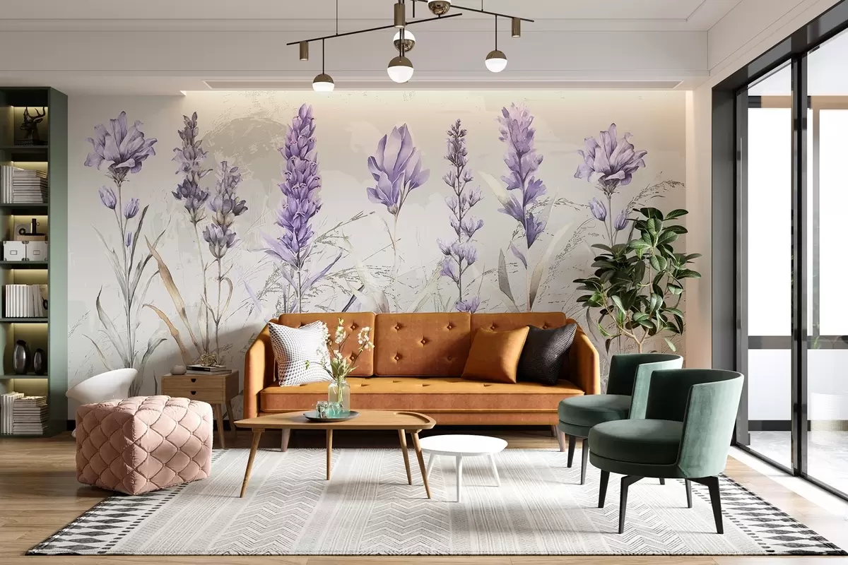 Wall murals A field of purple watercolor lavender flowers with soft, blurred textured beige background Nr. w08346