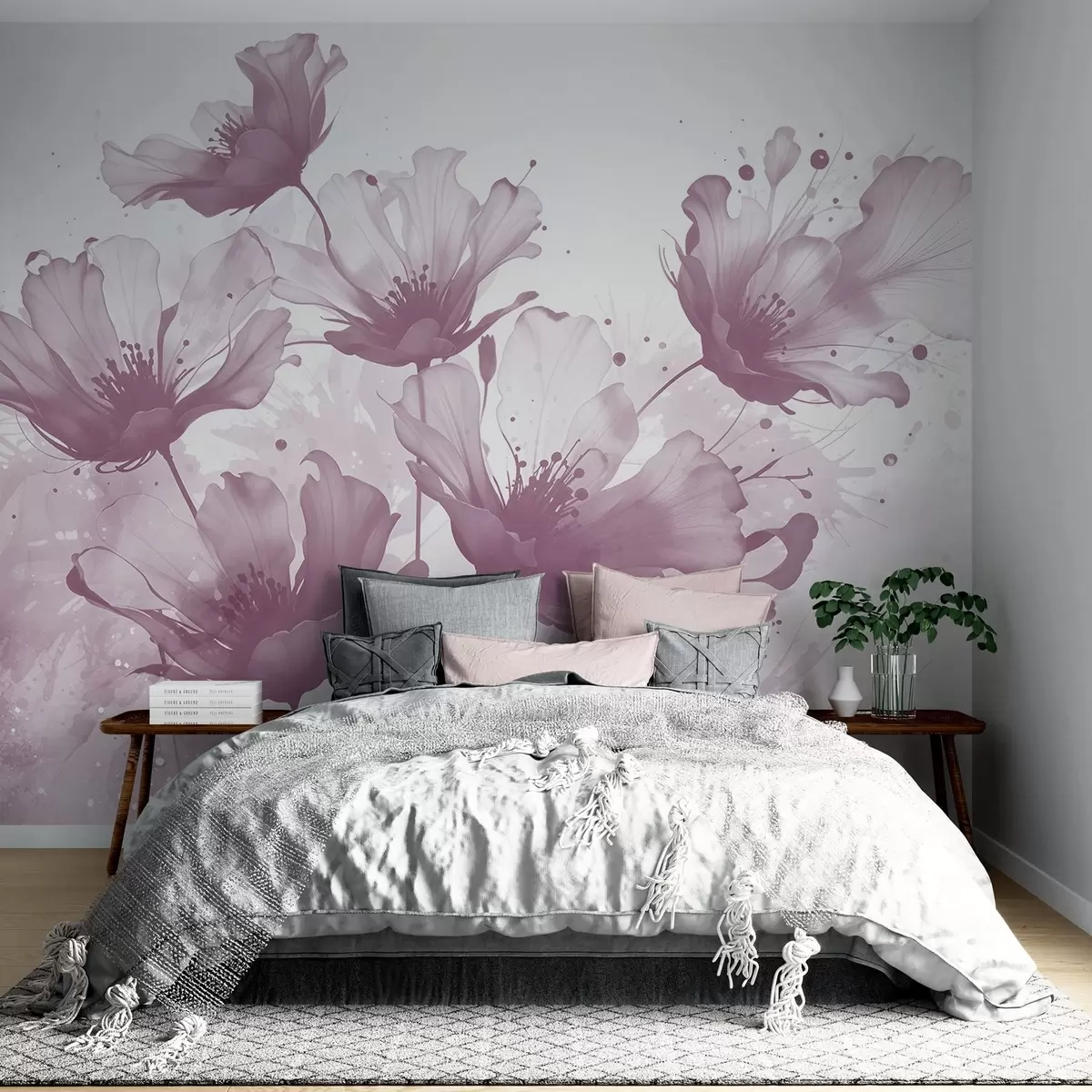 Wall murals Delicate pink flowers with soft, blurred petals and watercolor splashes against a light background Nr. w08376v2