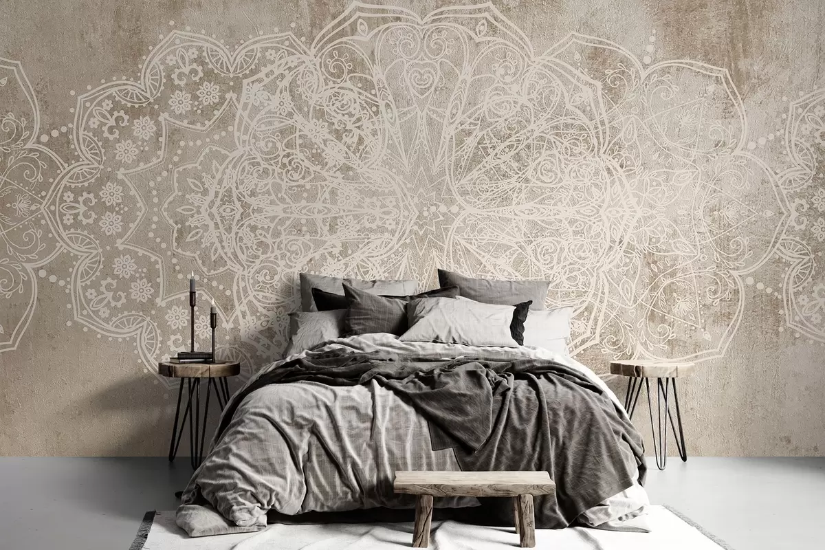 Wall murals A detailed, intricate white lace mandala pattern on a textured loft beige-brown wall background Nr. w08387v1