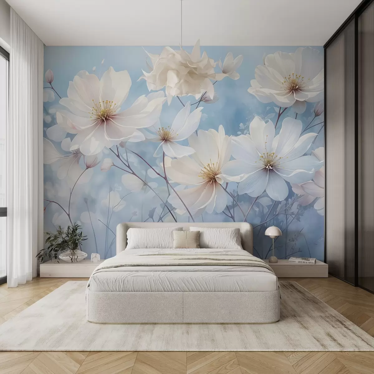 Wall murals Delicate white flowers with soft petals against a blurred blue background, creating a serene and ethereal atmosphere Nr. w08412
