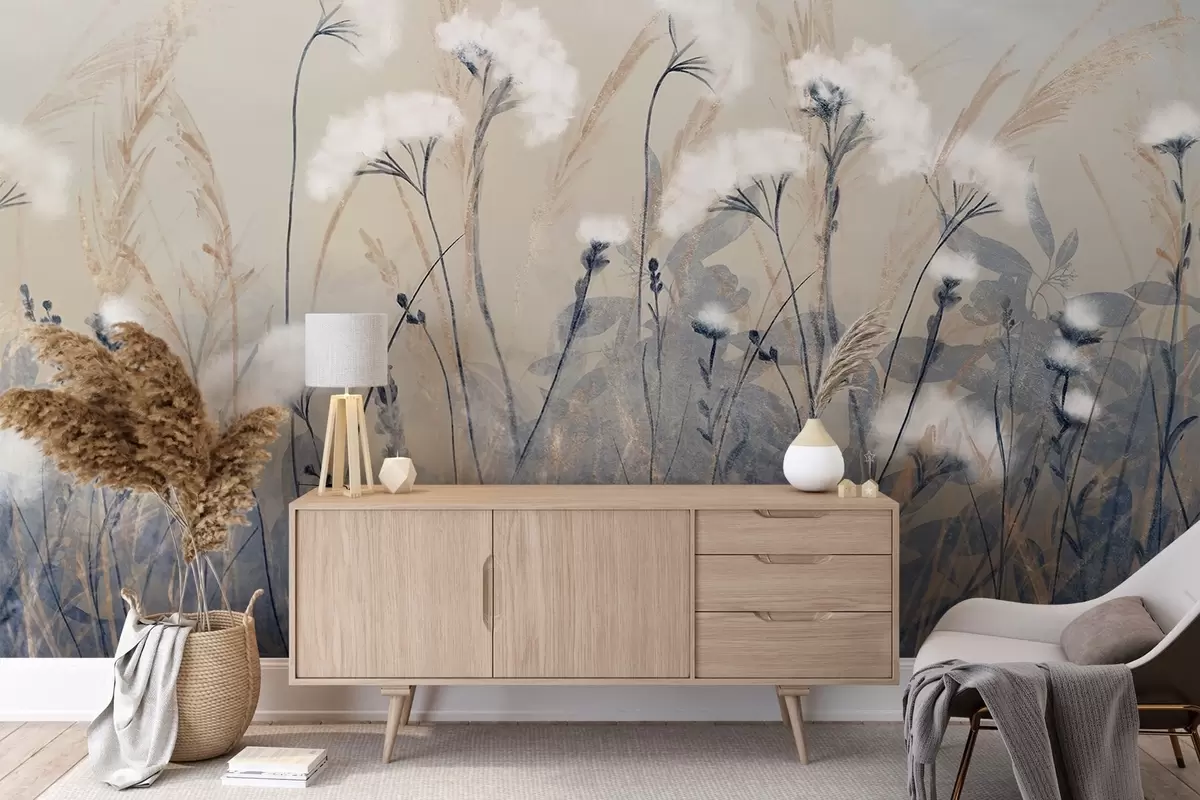 Wall murals Fluffy white cotton grass against a blurred textural background, with a soft, hazy, and serene atmosphere Nr. w08416