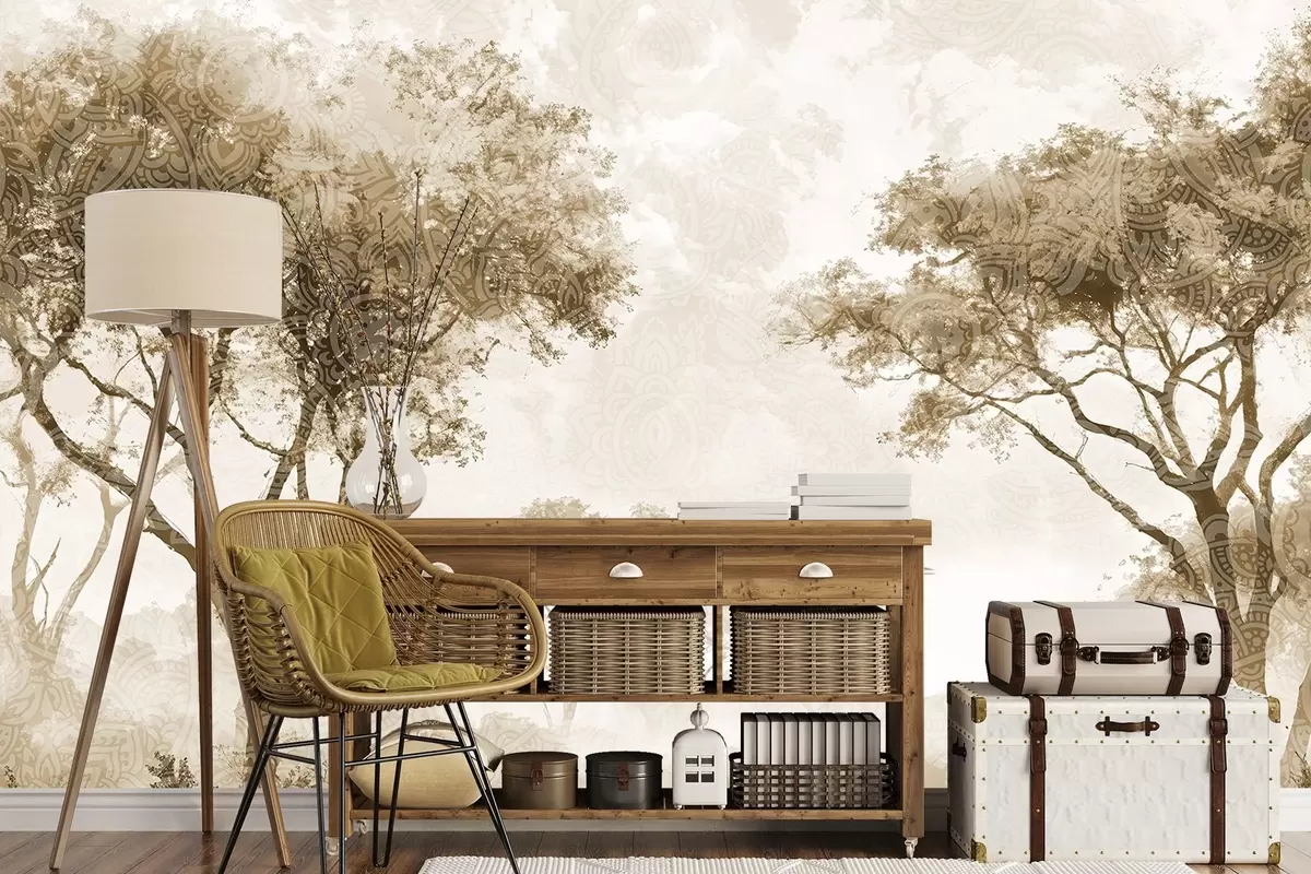 Wall murals A misty, serene landscape with silhouetted trees in the foreground with soft fog in shades of brown and beige Nr. w08442v2