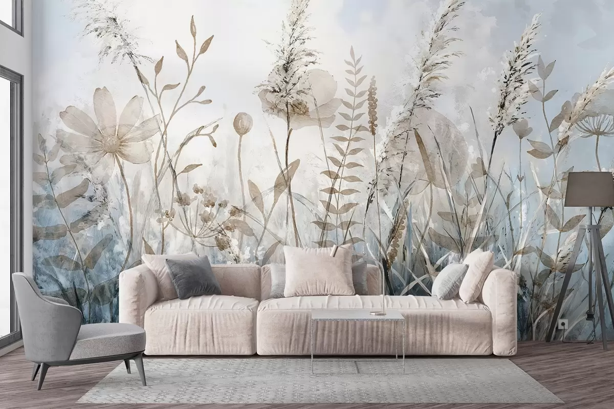 Wall murals A field of tall grass, natural foliage and plants with soft, wispy textures against a hazy, overcast sky Nr. w08472