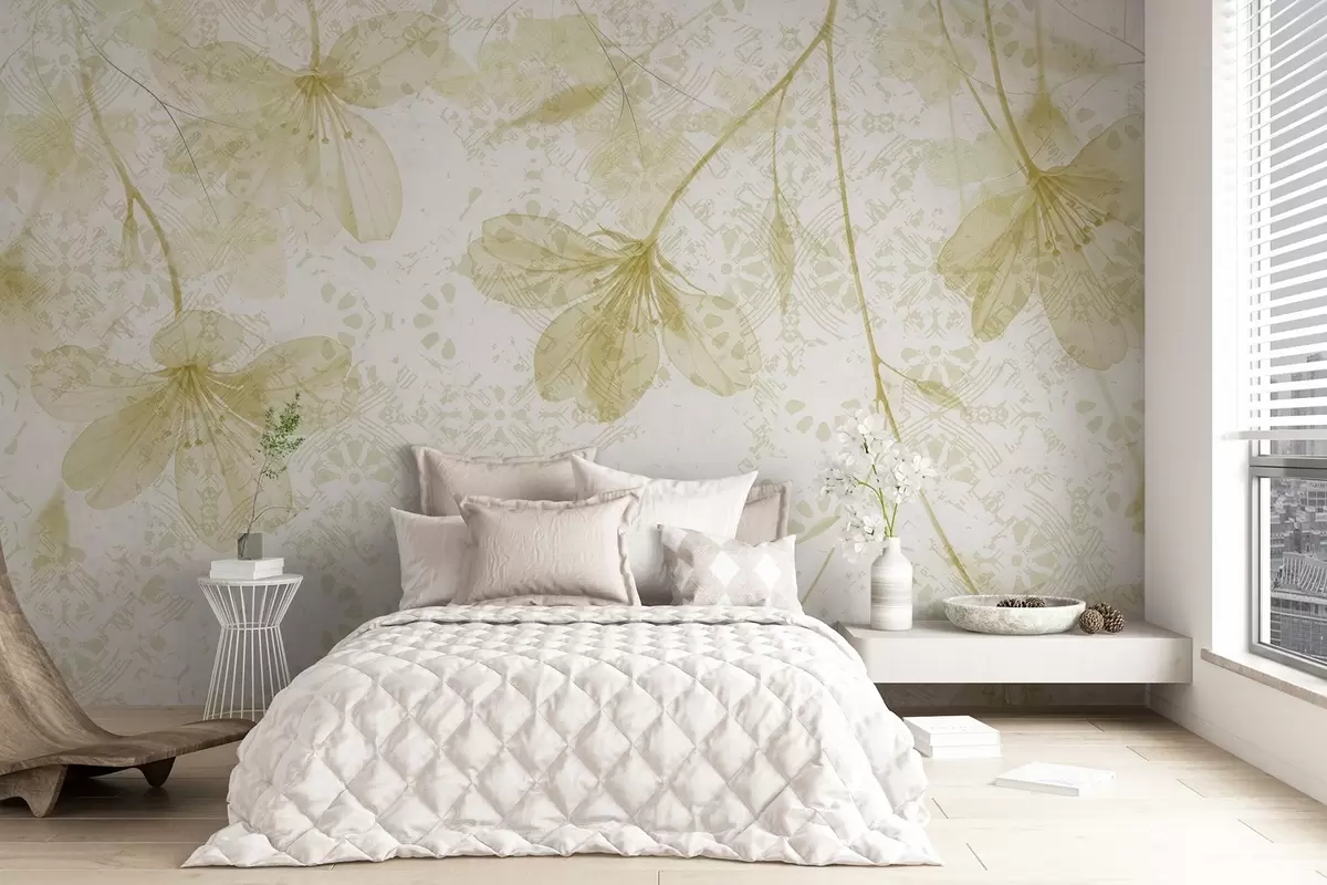 wall murals Delicate yellow and white flowers with long stems and petals against a soft, blurred textural background w08588v2