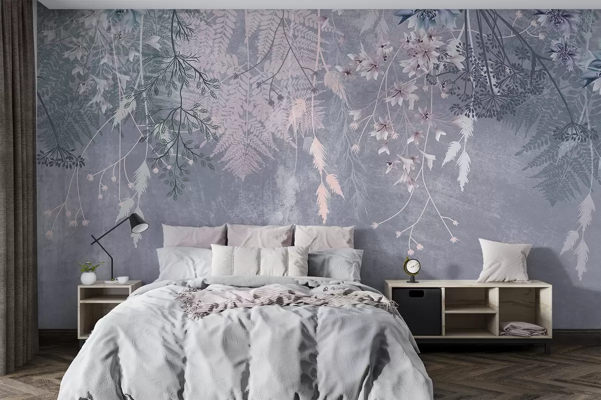 Wall murals A dreamy, delicate, wispy plants, spikelets and flowers in blue pastel colors against a hazy, textured background Nr. w08606