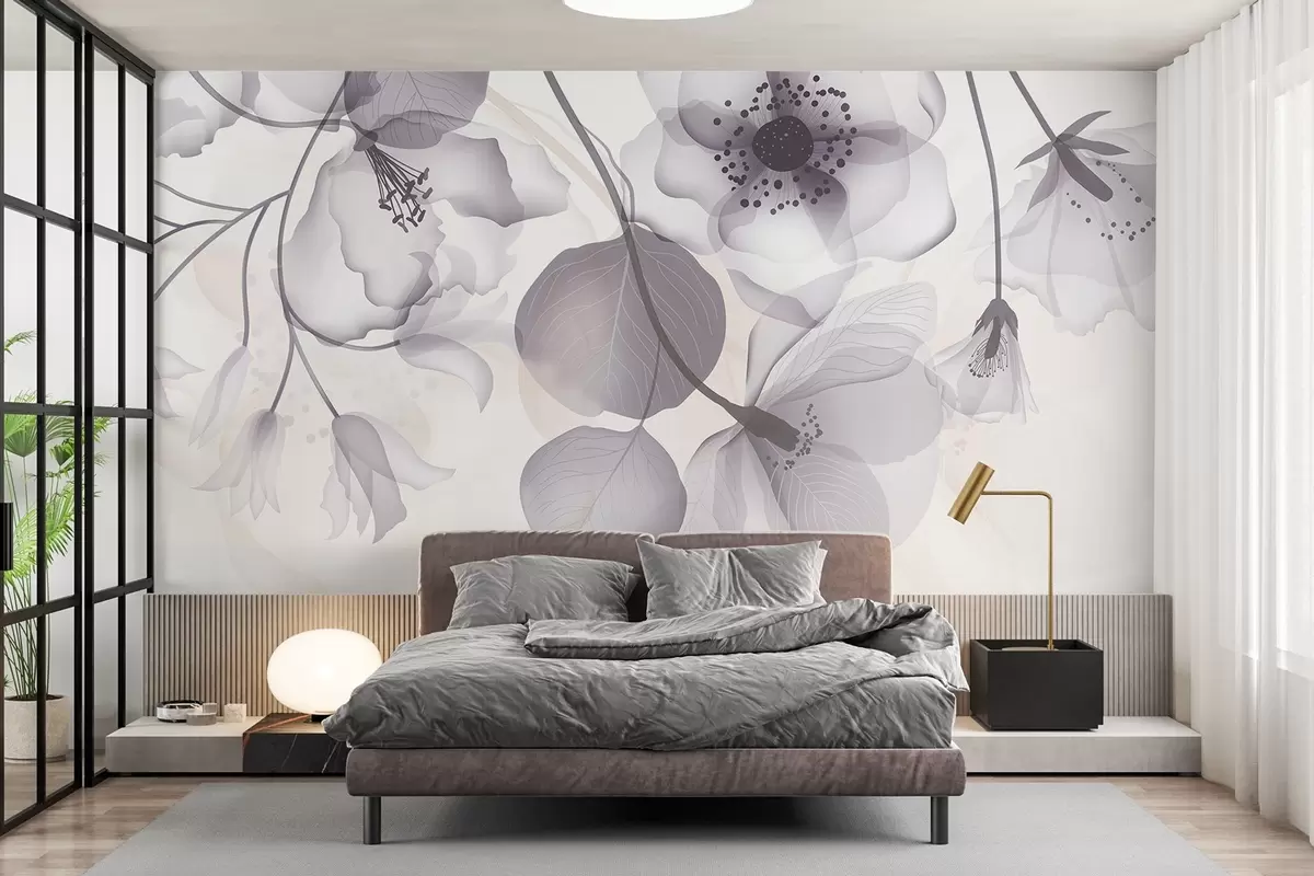 Wall murals Delicate gray and beige translucent flowers with soft petals and dark centers, against a light background Nr. w08613v2