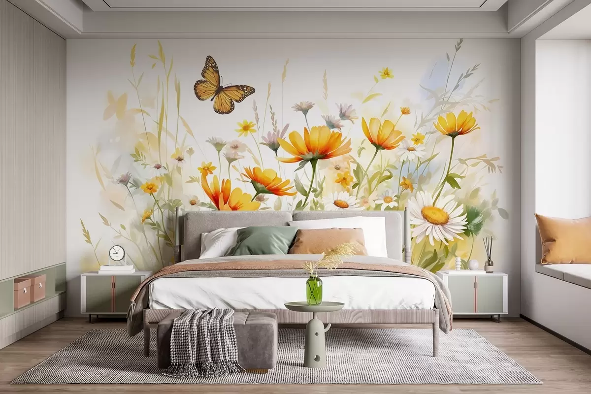 Wall murals A vibrant watercolor-like field of flowers featuring orange and yellow blooms with a butterfly above the flowers Nr. w08739