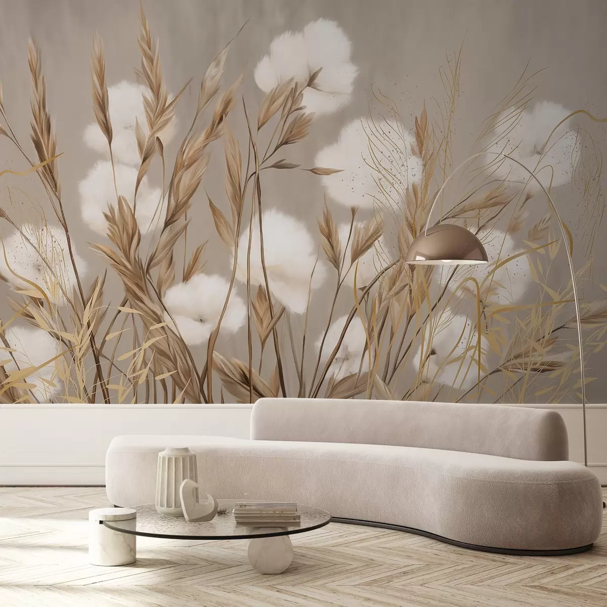 Wall murals Soft, fluffy cotton white flowers and tall orange spikelets grasses against a muted textured beige background Nr. w08784