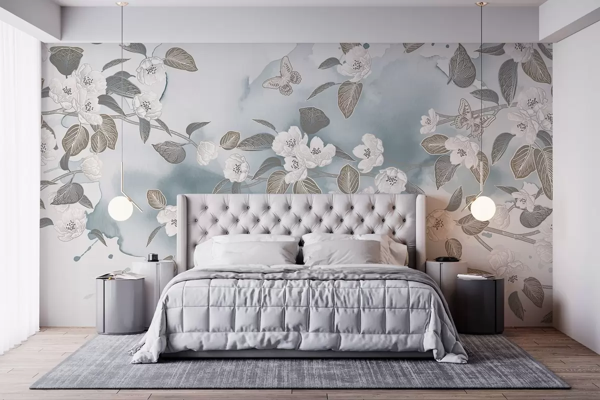 Wall murals Cherry tree blossom branch with flowers, leaves, butterflies on a light blue watercolor textured background Nr. w08831v1