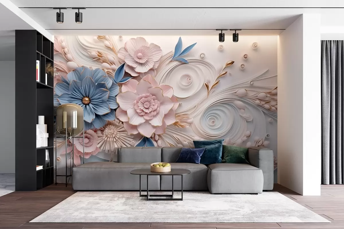 Wall murals A delicate floral composition in pink and blue tones with a soft relief background Nr. w08847