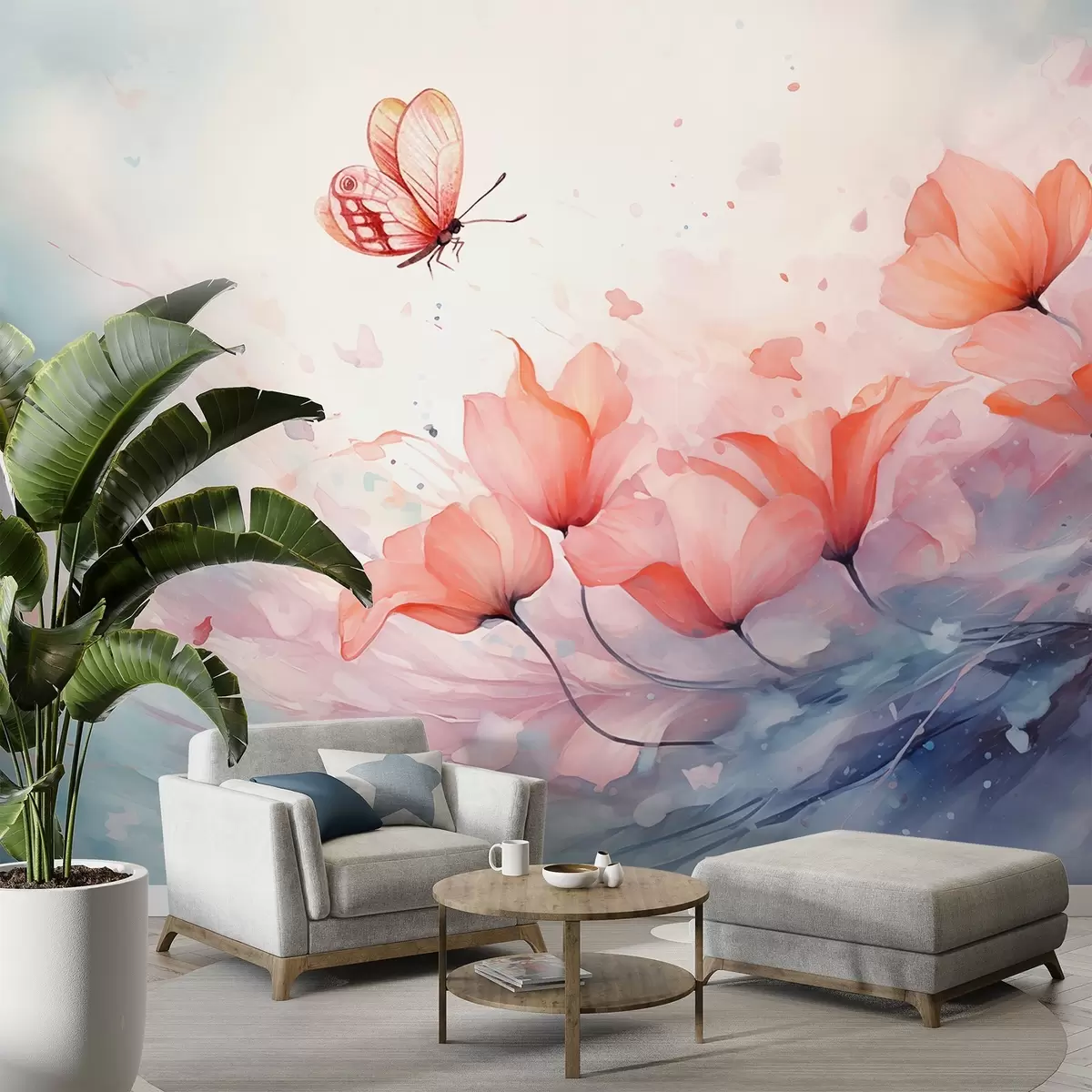 Wall murals Delicate poppies with a butterfly in a watercolor style Nr. w08849