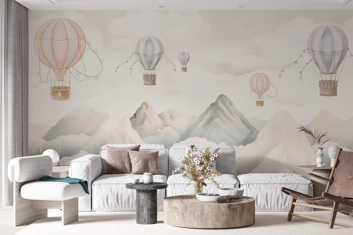 Wall murals Hot air balloons floating above mountains in neutral, soft pastel tones Nr. w08853
