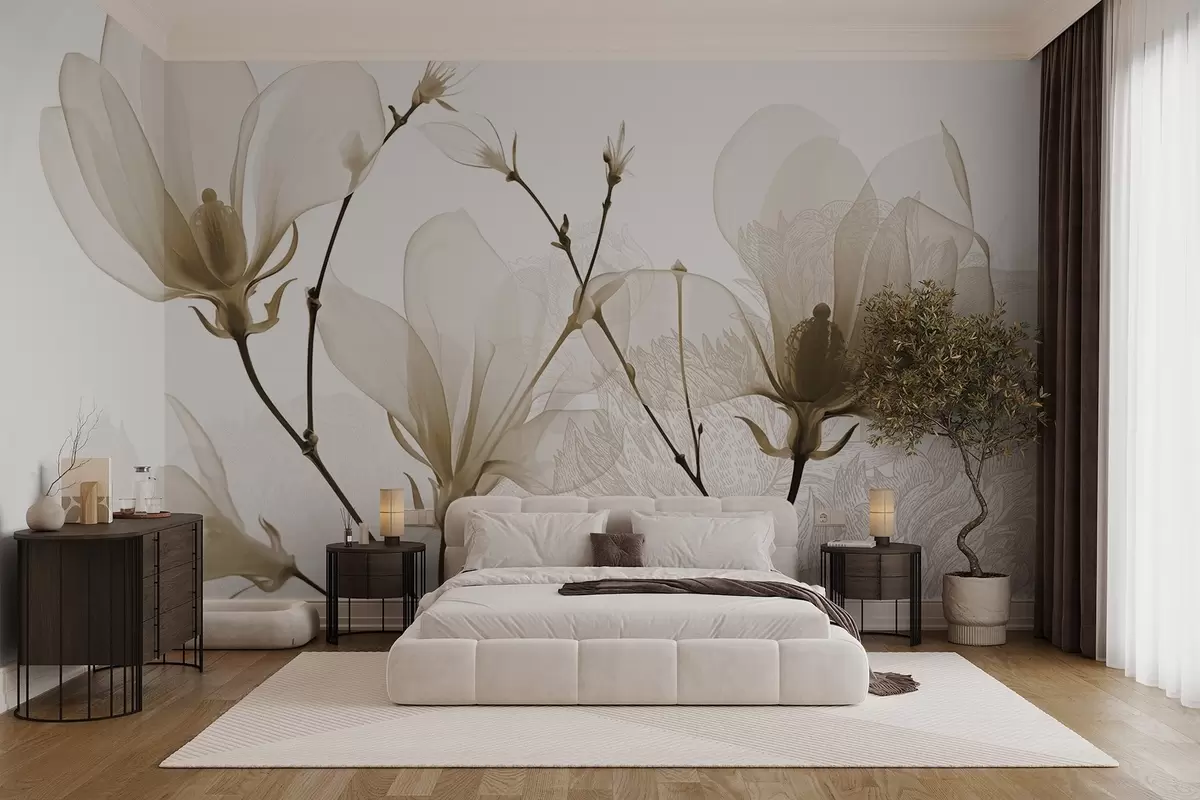 Wall murals Translucent beige magnolia flowers with flowers silhouettes with delicate petals and dark stems Nr. w08978v1