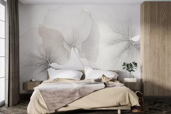 Wall murals Three translucent leaves with visible veins, with noise texture overlapping slightly, with thin stems on a white background Nr. w09052