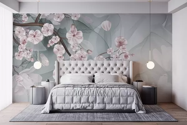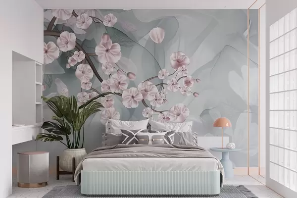 Wall murals Cherry blossom branches with pink flowers and petals, brown branches, abstract muted background with flowing effect Nr. w09054