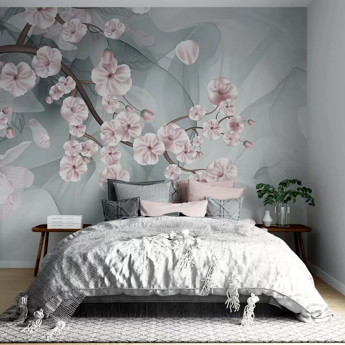 wall murals Cherry blossom branches with pink flowers and petals, brown branches, abstract muted background with flowing effect w09054