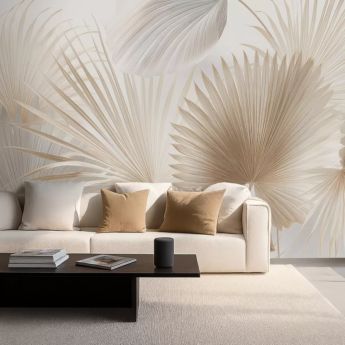 Wall murals Soft tropical leaf fans in light beige and bluish tones Nr. w09084