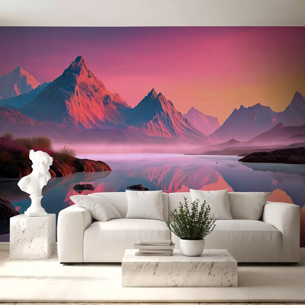 Wall murals Romantic sunset landscape with a river and mountains in pink shades Nr. w09093