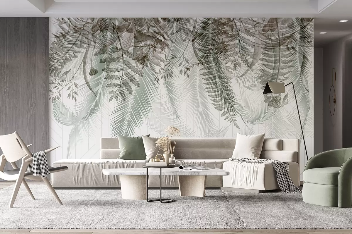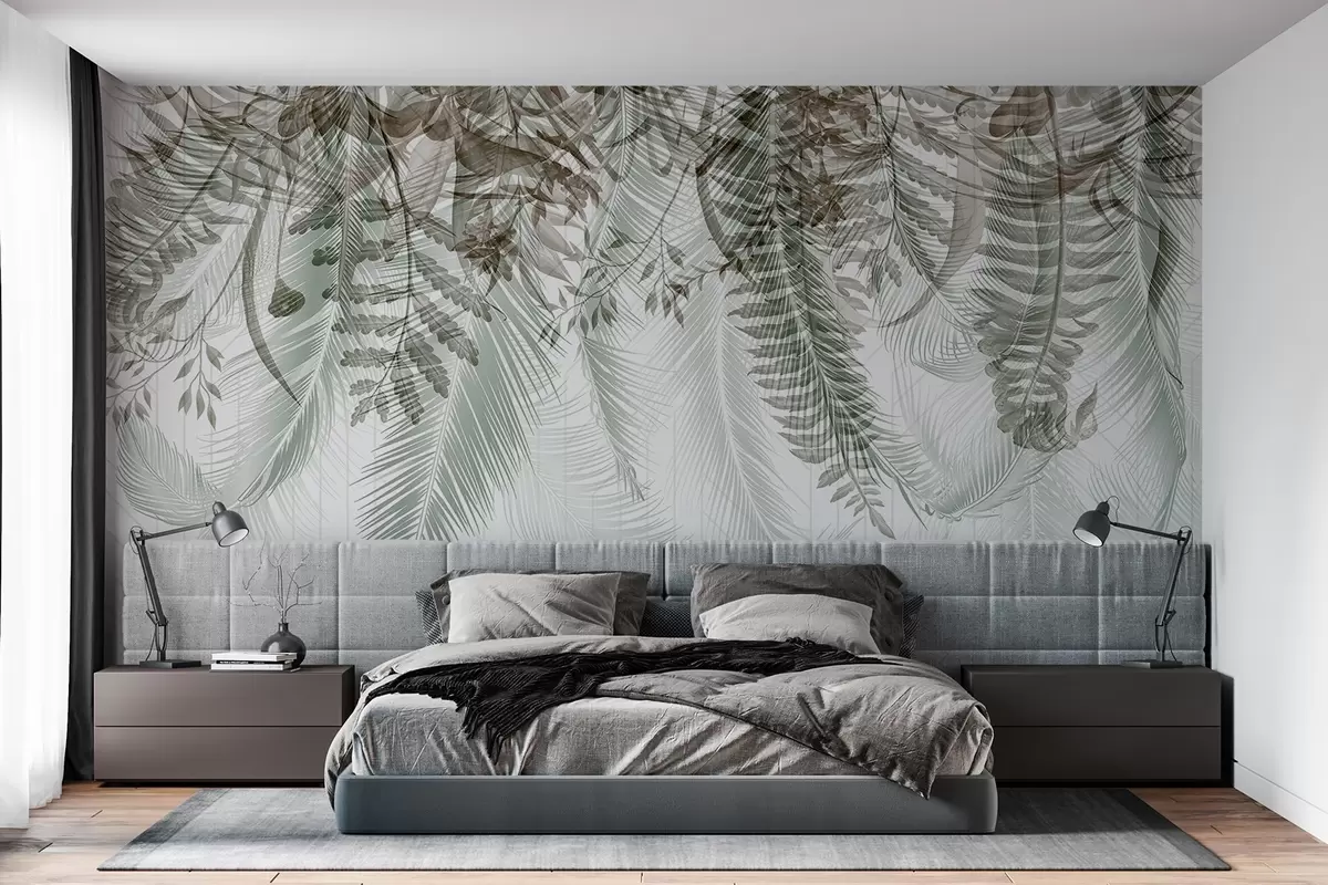 Wall murals Delicate falling tropical fern and palm leaves, geometric background, soft light, muted colors, elegant Nr. w09106v1