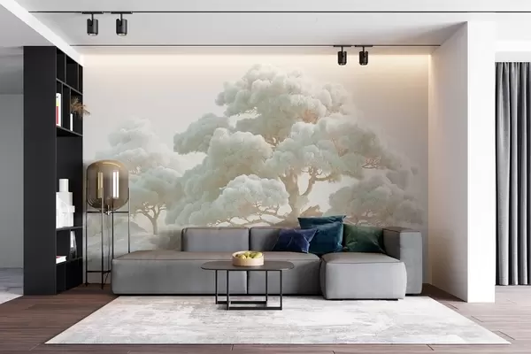 Wall murals Pine trees in the mist in soft tones standing in a forest Nr. w09122