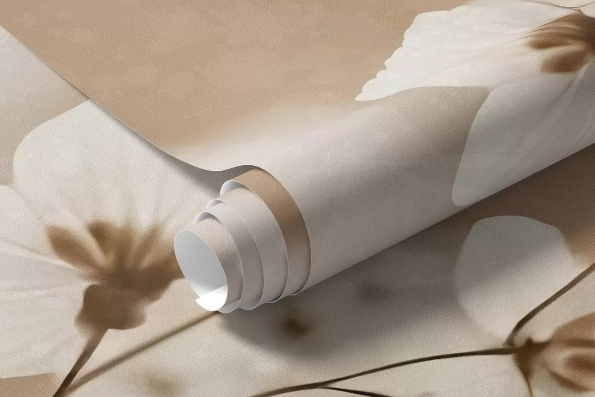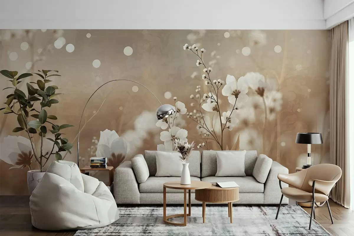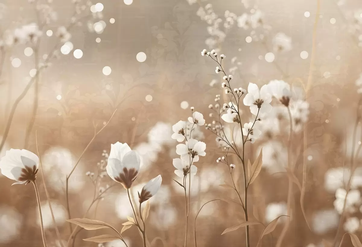 Wall murals White flowers with brown stems and leaves in a field, bokeh effect, warm color palette, elegant nature-inspired artwork Nr. w09135