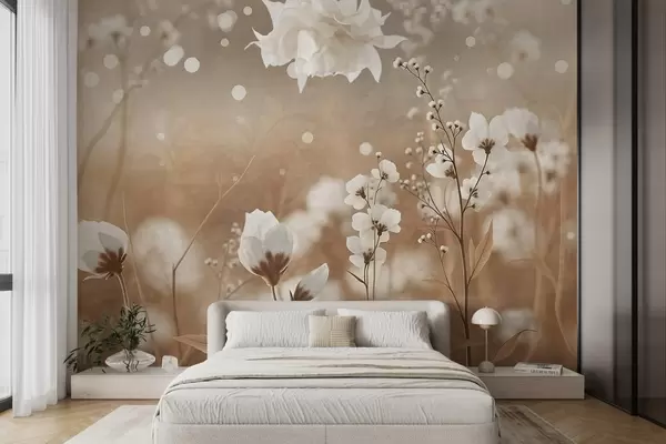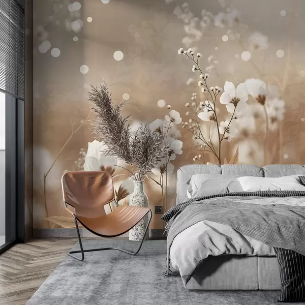Wall murals White flowers with brown stems and leaves in a field, bokeh effect, warm color palette, elegant nature-inspired artwork Nr. w09135