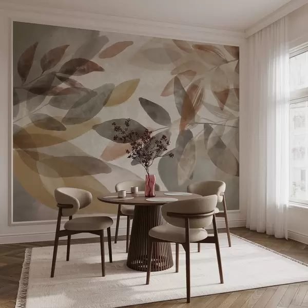 Wall murals Abstract textured leaves in muted brown, beige and gray tones, transparent shapes, minimalist style, organic shapes Nr. w09140