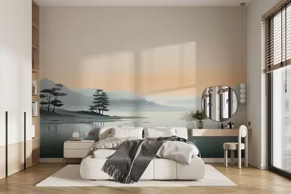 Wall murals Minimalist landscape with misty mountains and a lake Nr. w09151