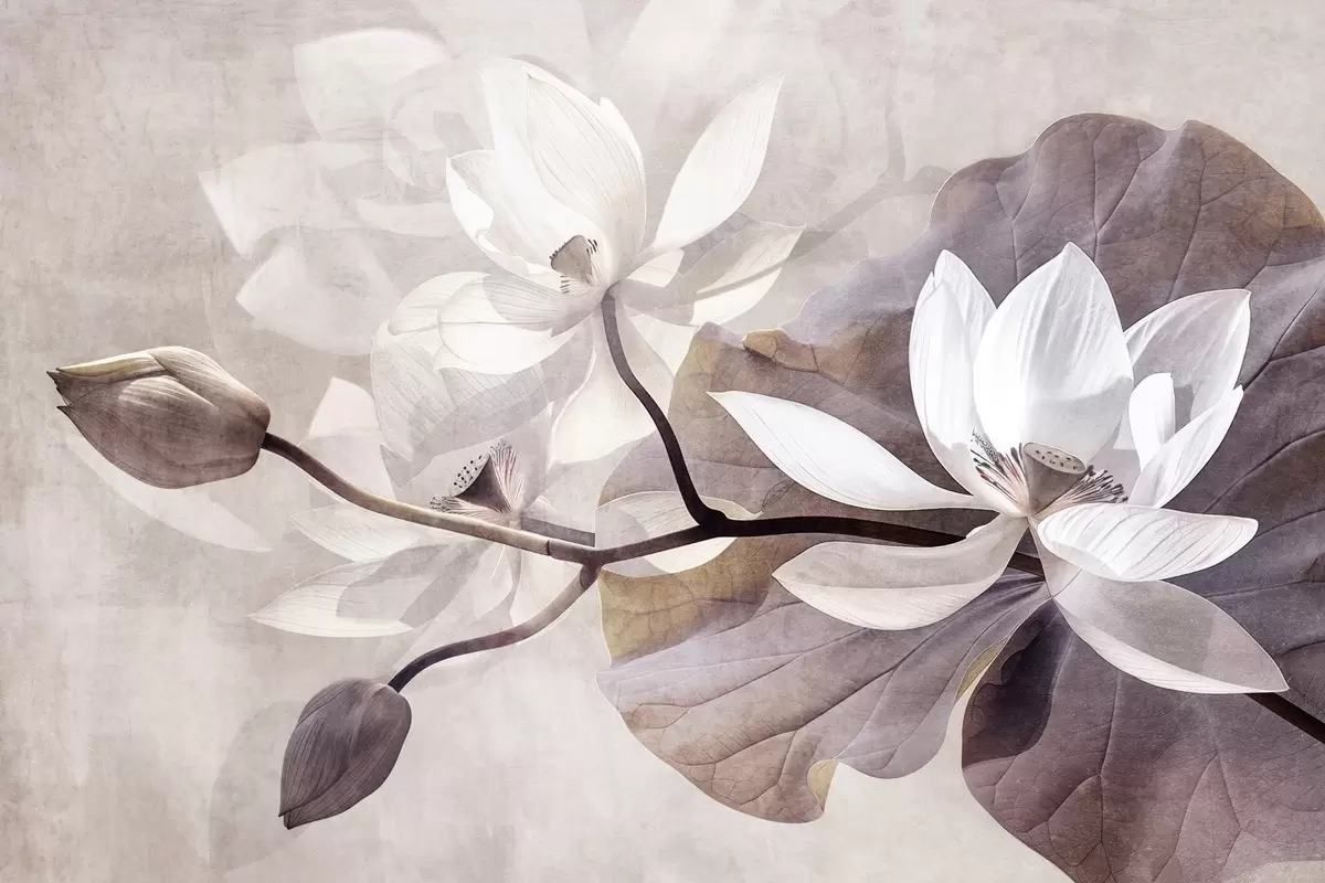 Wall murals Grainy textured muted delicate lotus flowers with leaves and stems in a soft, beige color palette Nr. w09159