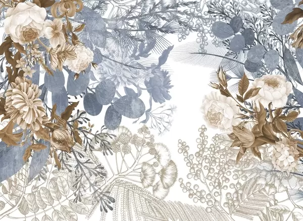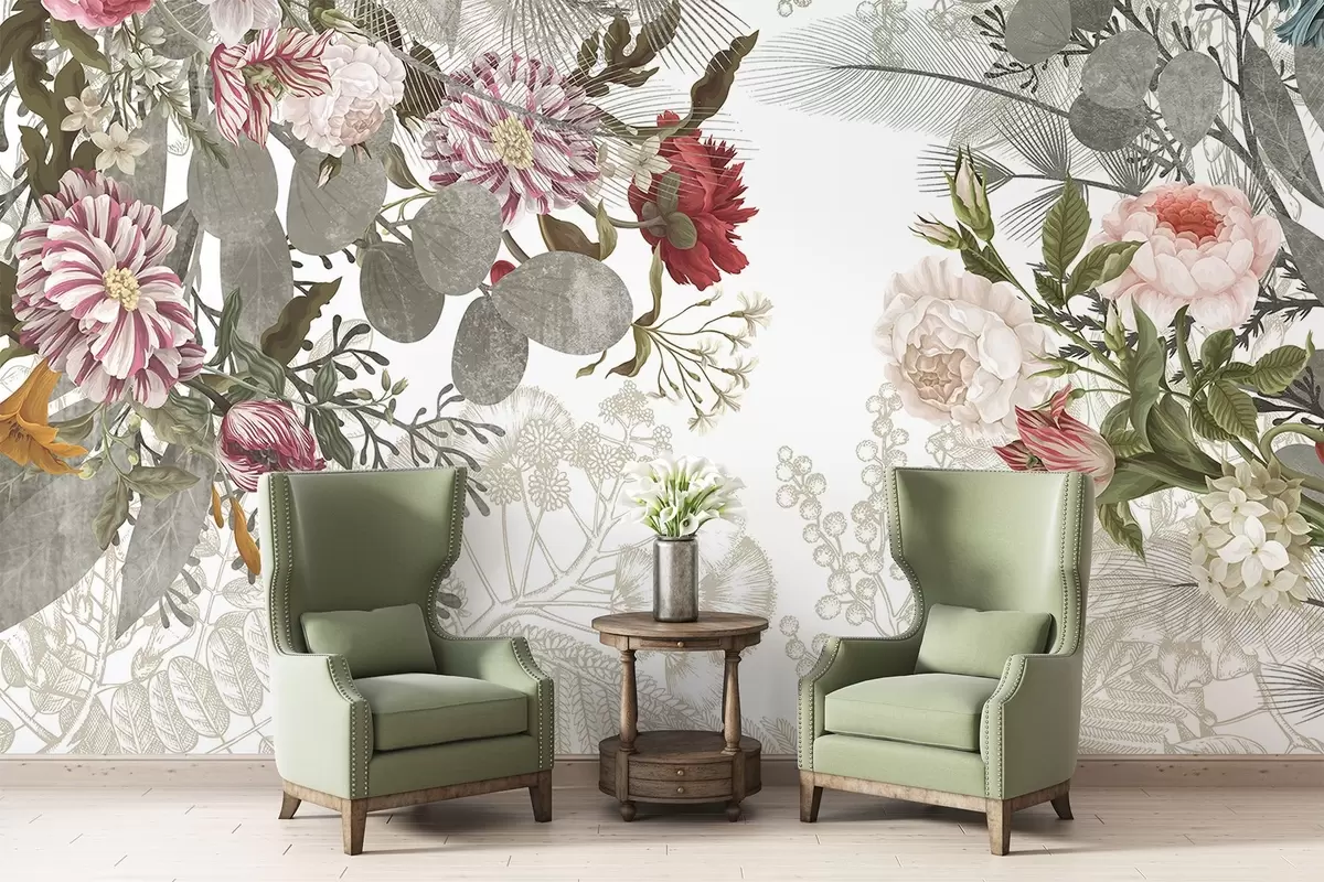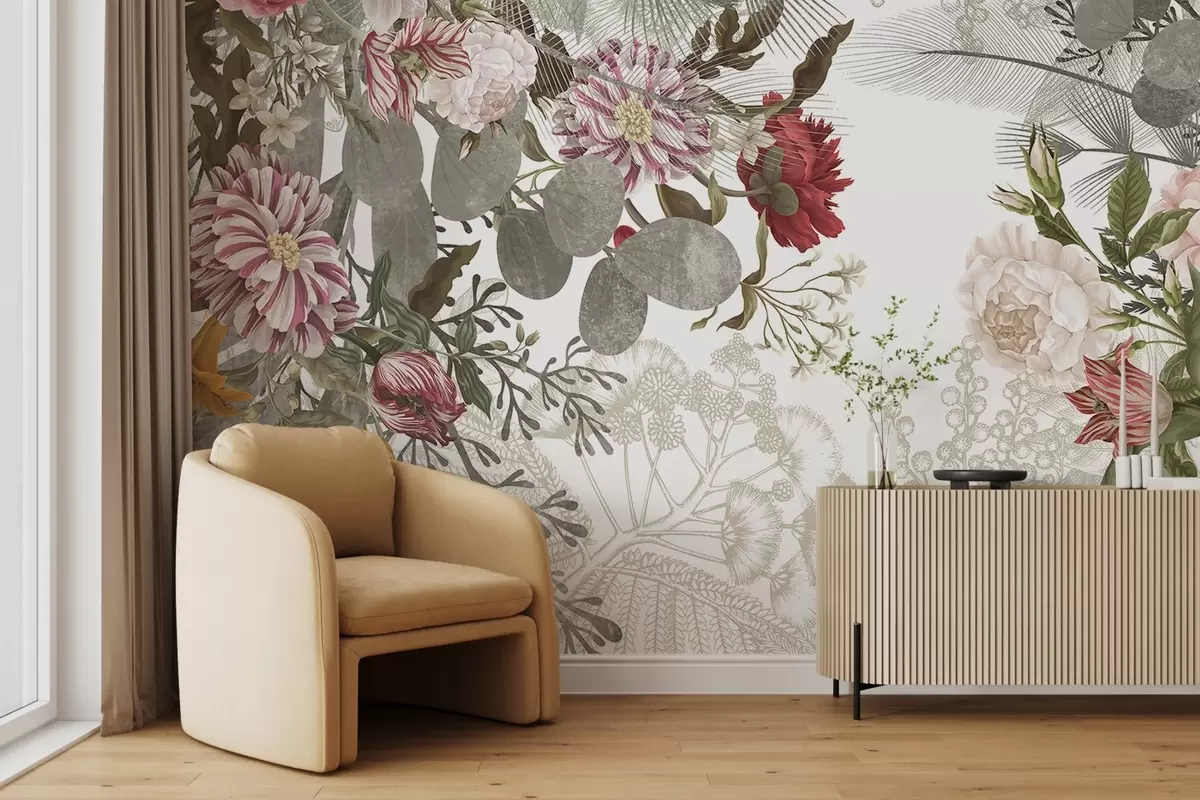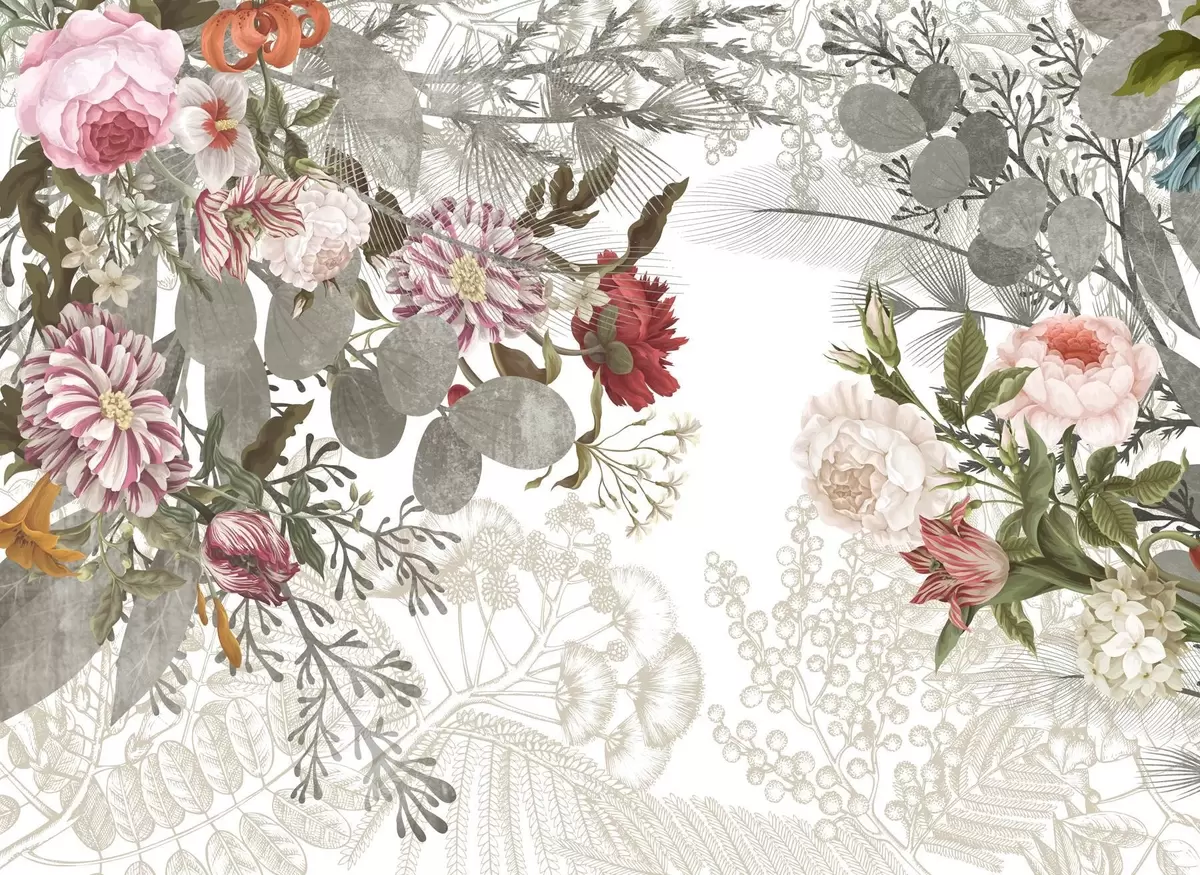 Wall murals Vintage floral arrangement with roses, eucalyptus, and mimosa in shades of muted green, red and pink Nr. w09164v1
