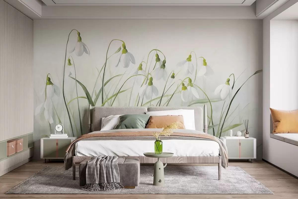 Wall murals Snowdrop flowers with green textured stems and leaves, watercolor spring style, delicate brushstrokes Nr. w09195