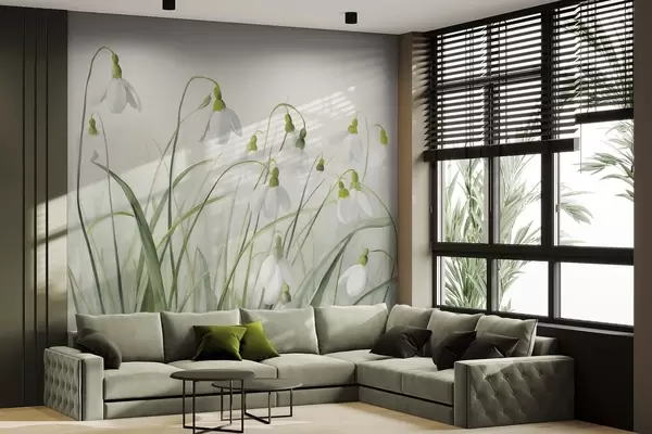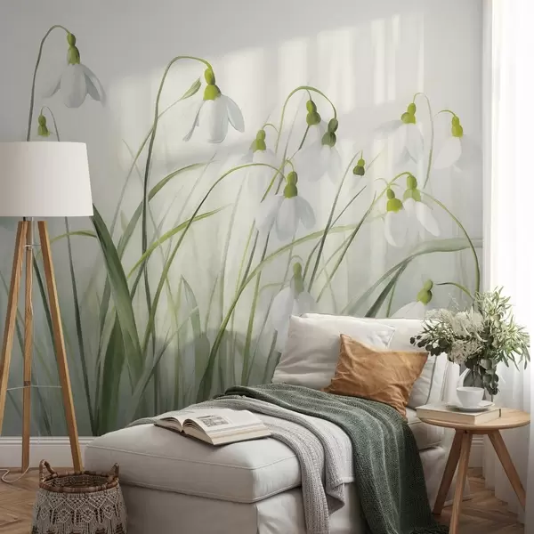 Wall murals Snowdrop flowers with green textured stems and leaves, watercolor spring style, delicate brushstrokes Nr. w09195