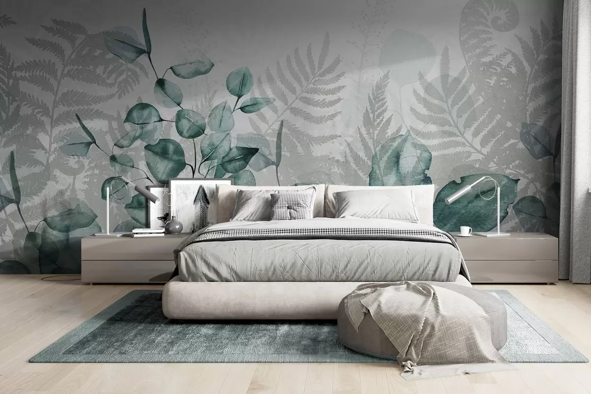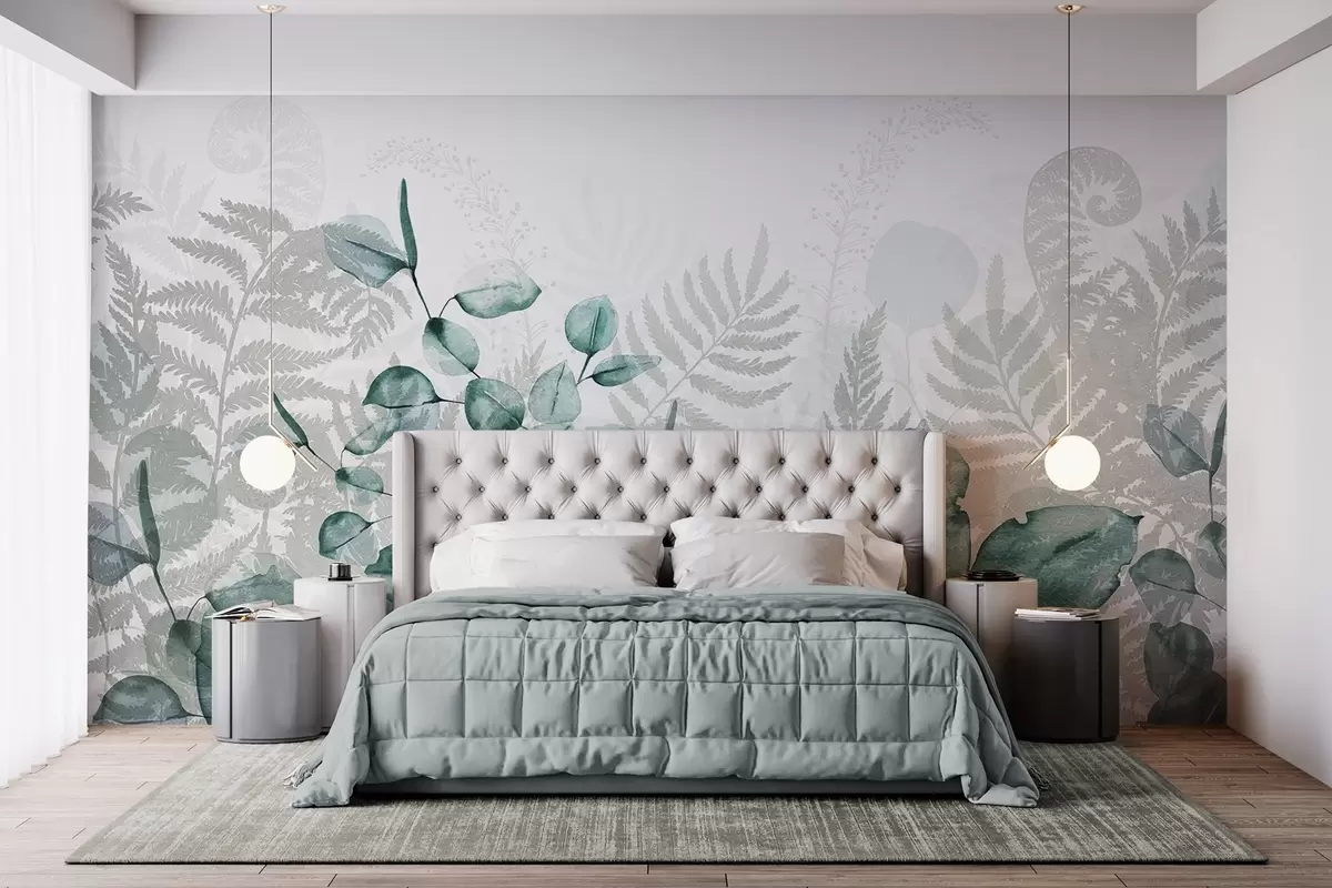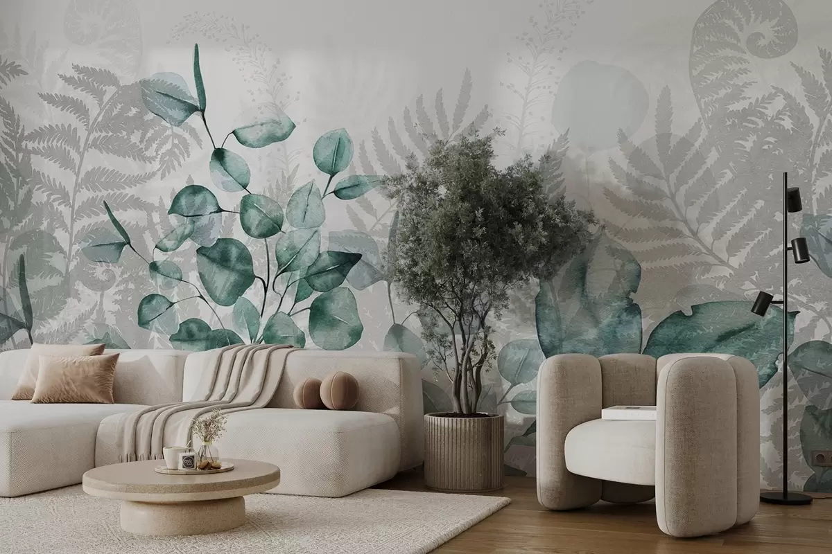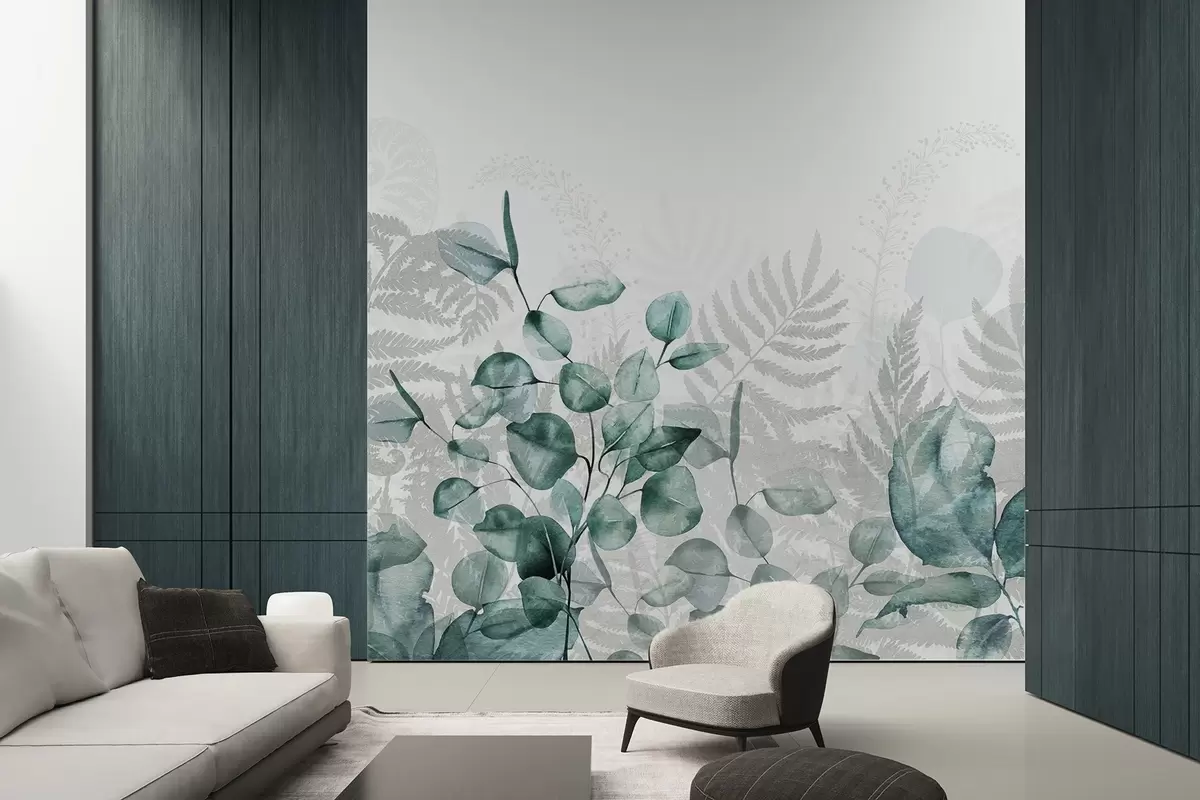 Wall murals Eucalyptus and fern leaves in shades of green and gray, watercolor effect , botanical illustration Nr. w09197