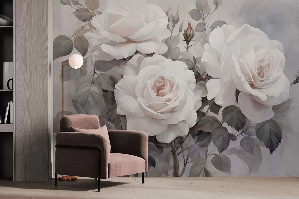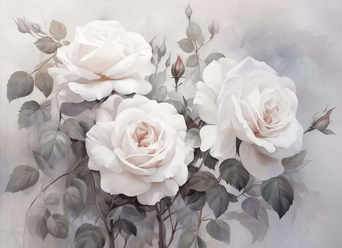 Wall murals Textured white roses with leaves and stems, soft muted pastel colors, elegant vintage style , delicate brushstrokes Nr. w09198