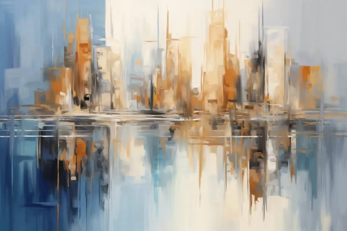 wall murals Abstract textured cityscape with tall buildings in shades of orange, blue and white, reflected in water w09207