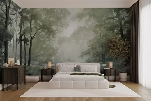 Wall murals Textured forest landscape, trees with green leaves, pastel color palette Nr. w09210v2
