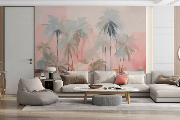 Wall murals Abstract minimalistic pastel tropical palm trees, against a background of soft pink and peach hues Nr. w09212